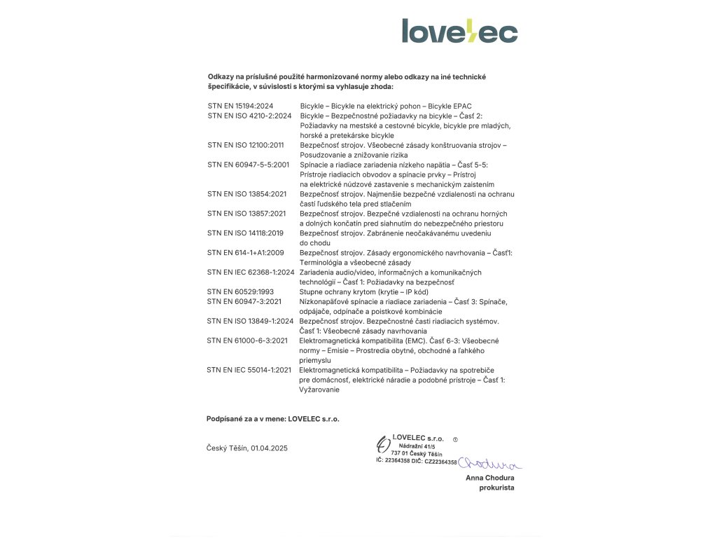 | nabíjačka | EN, CE, 36 V, 2 A, doba nabíjania 4–8 hodín (závisí na kapacite batérie a vybití) |