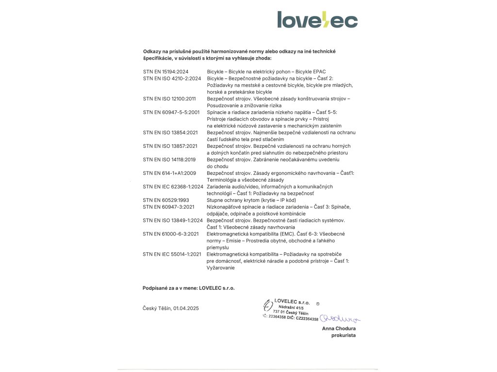 | nabíjačka | EN, CE, 36 V, 2 A, doba nabíjania 4–8 hodín (závisí na kapacite batérie a vybití) |