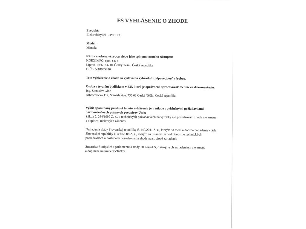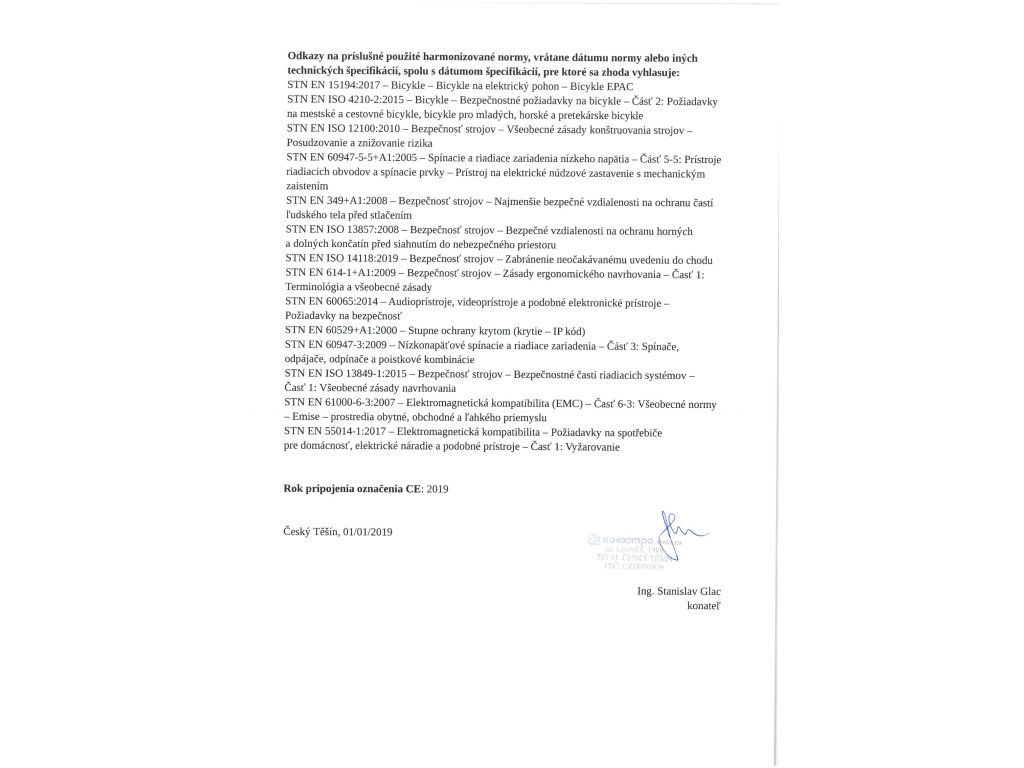 | nabíjačka | EN, CE, 36 V, 2 A, doba nabíjania 4–8 hodín (závisí na kapacite batérie a vybití) |
